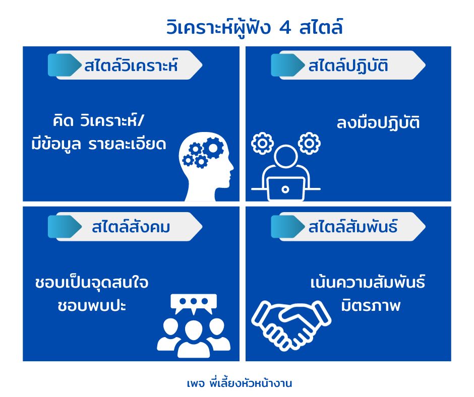 ผู้ฟัง จะมี 2 กลุ่ม คือ ผู้ฟังที่ชอบข้อมูล ข้อเท็จจริง ตัวเลข ( Fact ) และ และผู้ฟังที่ชอบความรู้สึก อารมณ์ ( Feeling ) แต่ด้วยผู้ฟังก็มีความหลากเลย จึงจำแนกผู้ฟังออกเป็น 4 สไตล์ ดังนี้